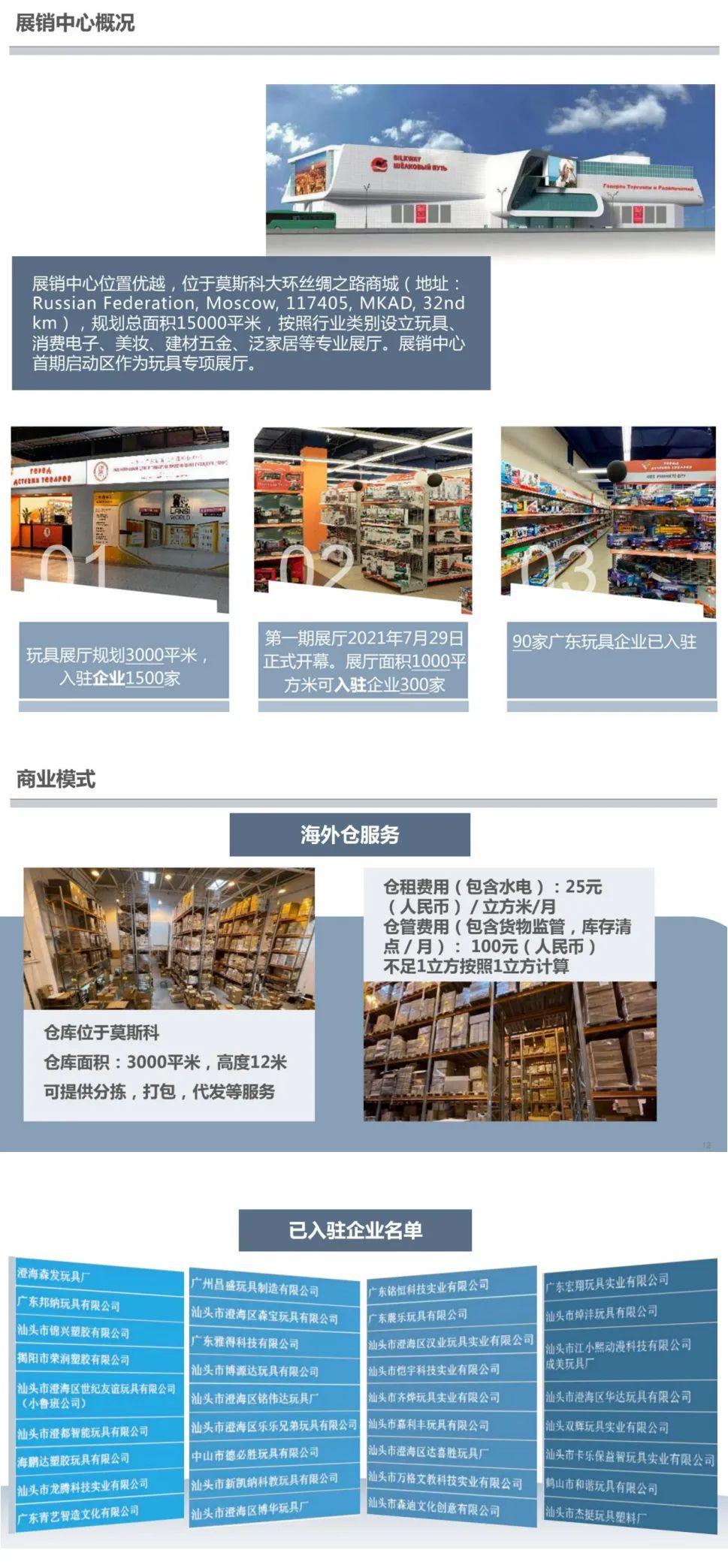 目前,俄羅斯粵商會已在莫斯(sī)科建立總麵積約(yuē) 15000 平米(mǐ)的“俄羅斯廣東商品展銷中心”,為(wéi)廣東品牌提供展示及 銷(xiāo)售的渠道(dào)和場(chǎng)地,打(dǎ)造廣東產品在俄羅斯的匯集地,並在莫斯科建立了超 3000 平米“廣東商品海外倉”,對接線上(shàng)及線(xiàn)下平台,為企業提供中俄清關、運輸代理、倉儲、監管、配送等服務(wù),並已幫助超過 200 家各(gè)行各業的民 營企業進(jìn)入俄羅斯市場。